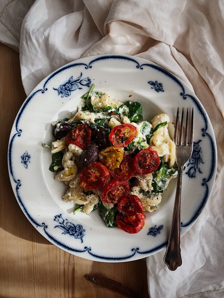 När pastan kokat klart blandar du den med den bakade fetaosten och babyspenaten. Servera med några drag nymalen peppar över.