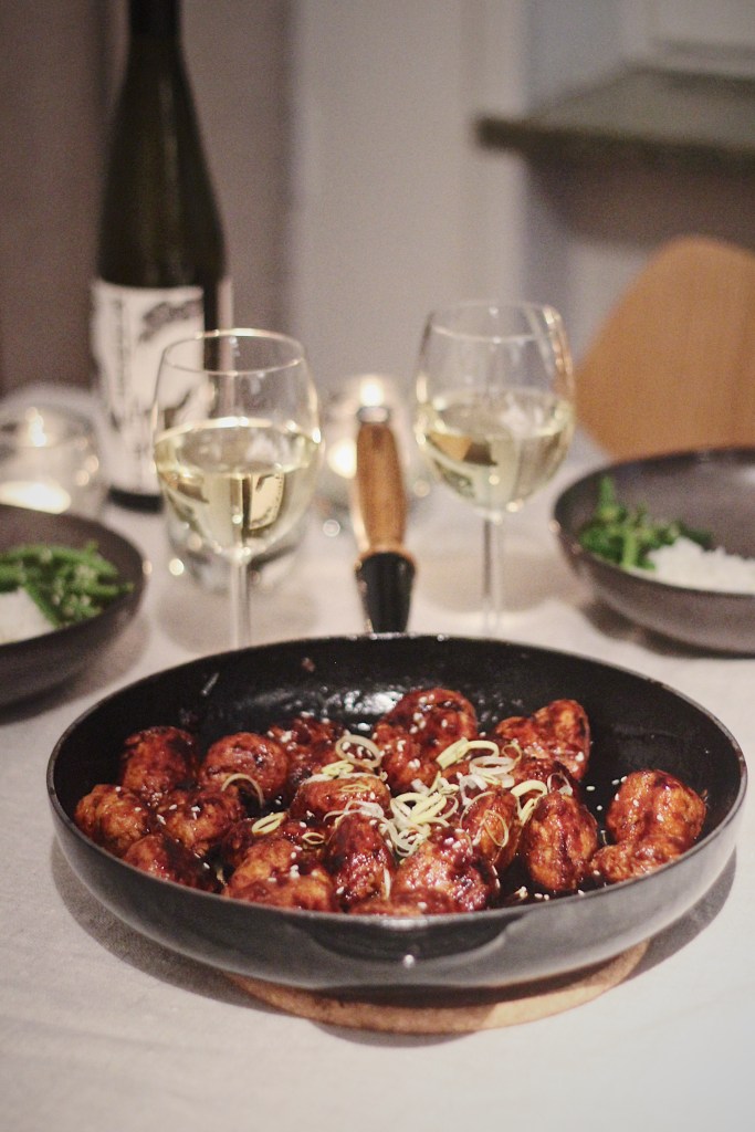 Finhacka en vitlök och finstrimla resten av ingefäran. Ta kycklingbollarna ur stekpannan och tillsätt vitlöken och ingefäran i samma fett som du tidigare stekte bollarna. Rör ihop resten av ingredienserna till såsen. När ingefäran och vitlöken fräst några minuter tillsätter du såsen. Låt puttra tills den reducerats till en tjockare, sirapsliknande konsistens. Tillsätt bollarna igen (och eventuell köttsaft som runnit av på fatet). Vänd runt dem i såsen och låt puttra i 5-10 minuter under lock.