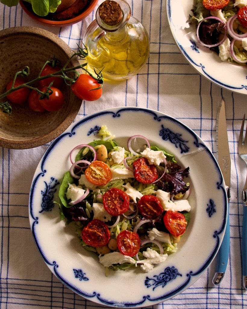 Koka risoni enligt förpackningen, häll av vattnet och blanda med de marinerade vita bönorna. Skiva upp rödlöken tunt. Ta ut tomaterna ur ugnen. Vänd ner småbladssallad med bönorna och risonin och lägg sedan upp på tallrik. Fördela de semitorkade tomaterna på tallrikarna och dra mozzarellan i bitar innan du lägger den och den skivade rödlöken på toppen.