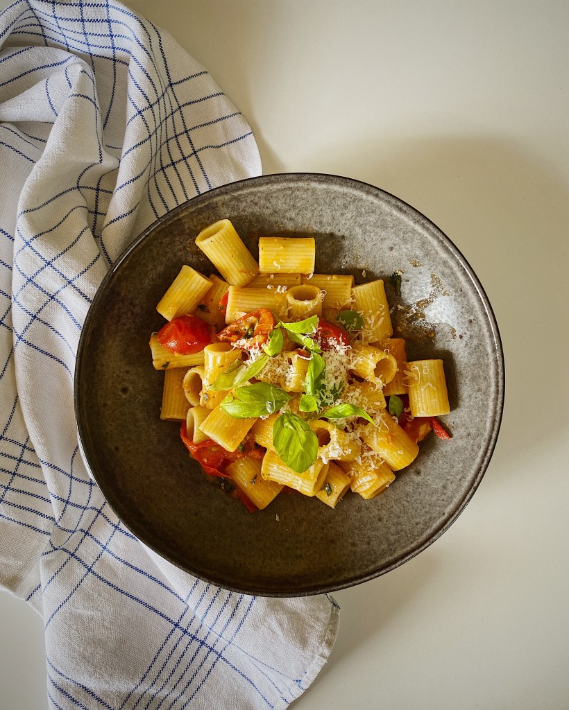 Koka pastan några minuter kortare än förpackningen säger. När pastan nästan är klar snor du någon dl av pastavattnet till tomaterna och låter stärkelsen från pastavattnet tillsammans med tomaterna bli en mysig liten sås.