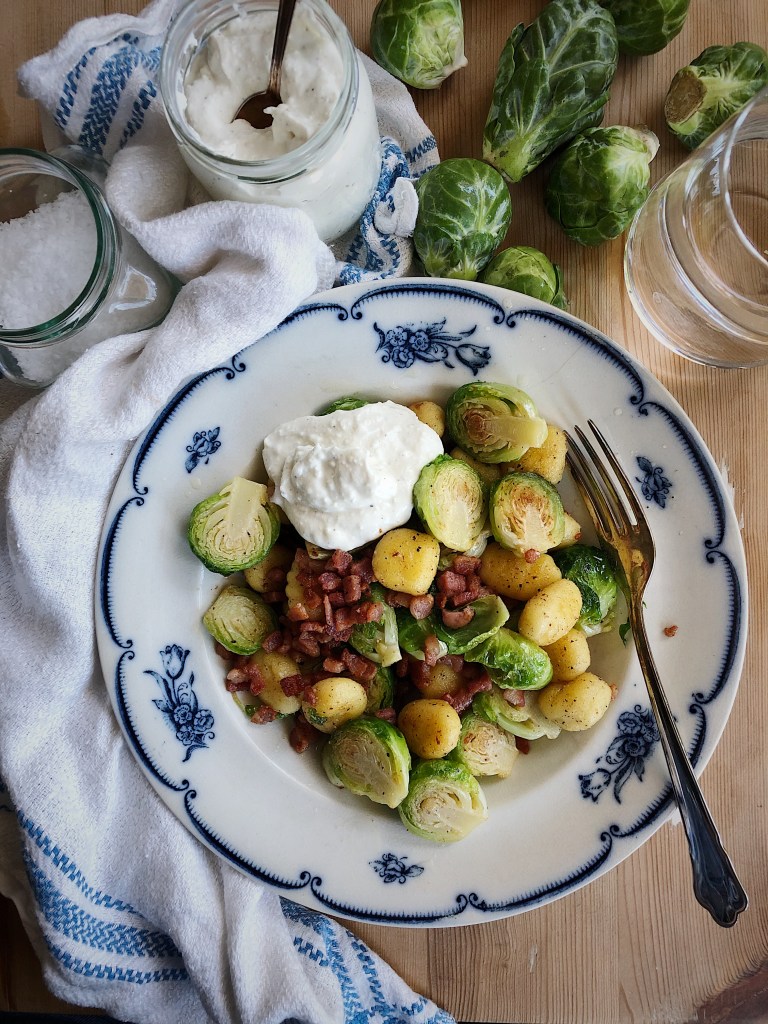 Hetta upp en stekpanna utan fett och fräs pancetta i den. När pancetta börjat få färg tillsätter du brysselkålen i pannan och låter den fräsas med. Tillsätt gnocchi i det kokande vattnet och koka någon minut. Häll av vattnet och tillsätt gnocchi i stekpannan tillsammans med pancettan och brysselkålen. Fräs till gnocchi börjat ta färg. Smaka av med peppar (salt behövs ej då både pancetta och fetaoströran är salt i sig).