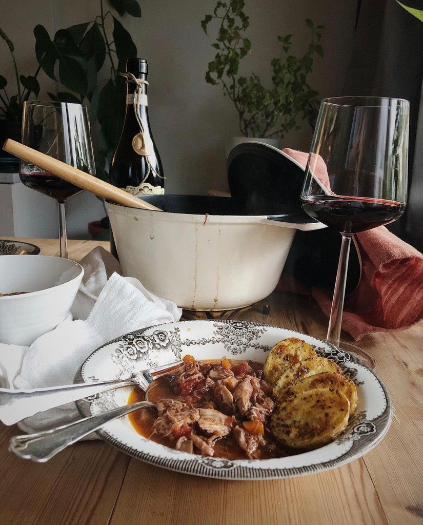 Med hjälp av valfria redskap pillar du sedan ut ben och brosk ur grytan. Tillsätt tomaterna och krossa dem lätt med slev. Tillsätt även lagerbladen och generöst med salt och peppar. Låt puttra 2-3 h till.