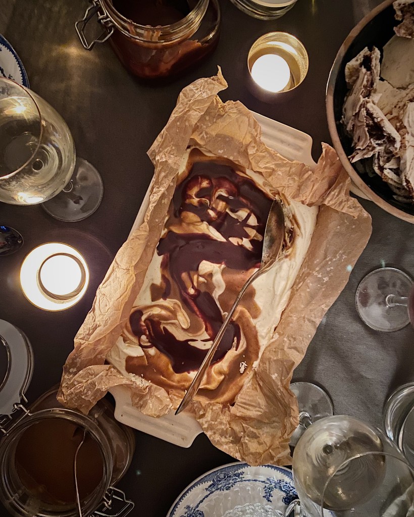 ringla de båda såserna över glassen. Med en spatel kan du bre och smeta ner såsen i glassen. Frys i minst 4h gärna över natten.