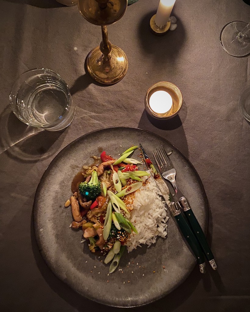 Skala och finhacka vitlök och ingefära samt strimla resterande grönsaker förutom broccolin, den kan du dela i munsbitsstora buketter och skära stammen i ca samma storlek som du strimlar moroten. Strimla kycklinglårfilén på en separat skärbräda.