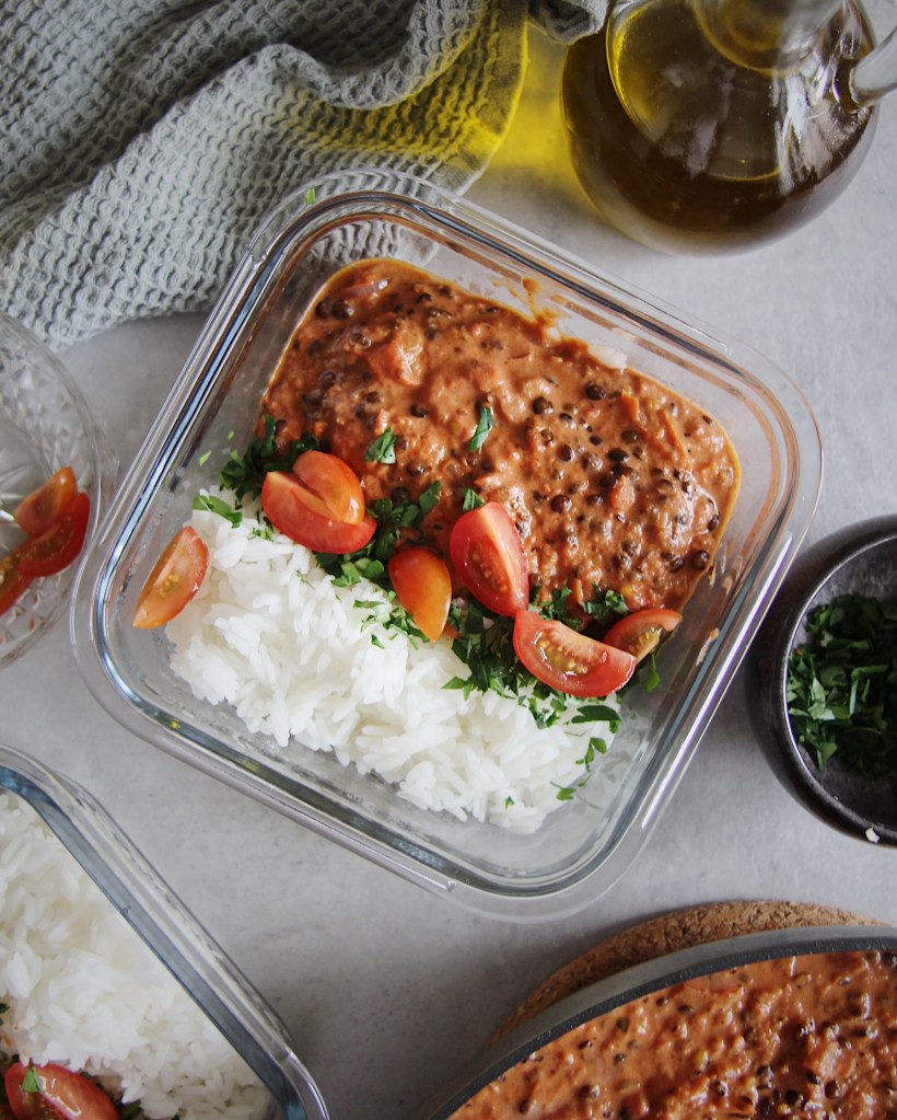 Tillsätt krossade tomtar, creme fraiches, buljongtärningen och balsamvinäger. Låt puttra i 20-30 minuter eller tills linserna är färdiga.