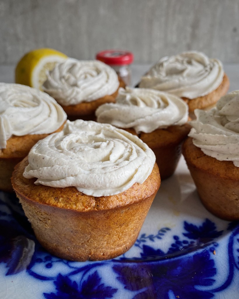 Rör ihop alla ingredienser till frostingen. Låt muffinsarna svalna helt innan du dekorerar dem med frostingen, antingen med hjälp av sprits eller så brer du på den med en matkniv.