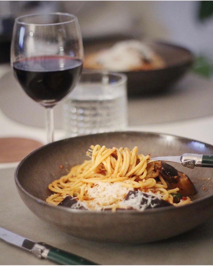 - Hetta upp rejält med olivolja i en stekpanna. Stek auberginen tills den är gyllene på alla sidor, det här momentet är viktigt då det inte blir gott om den upplevs rå/ej färdig – när den är genomstekt smakar den istället smör!
