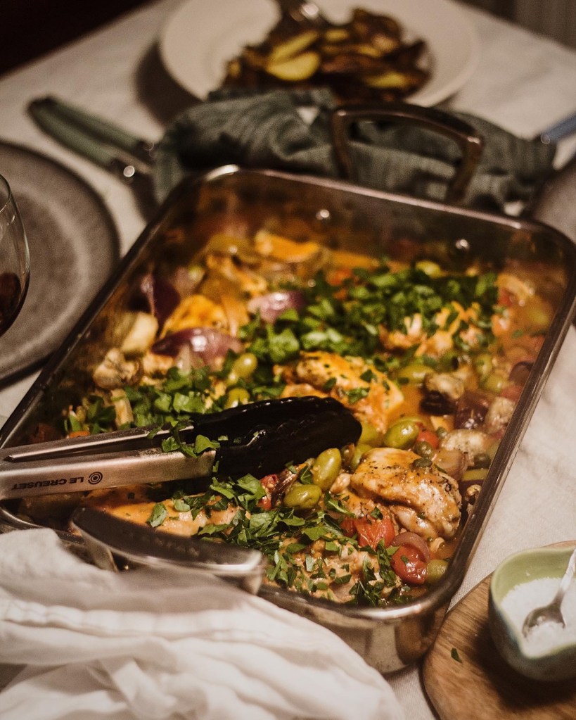 - Lägg kycklinglår, konserverade tomater, rödlök och vitlök i en ugnssäker form. Skölj av auberginen och tillsätt den, oliver och kapris. Salta och peppra. Vänd runt allt med valfritt redskap innan du stoppar in den i ugnen i ca 30 minuter.