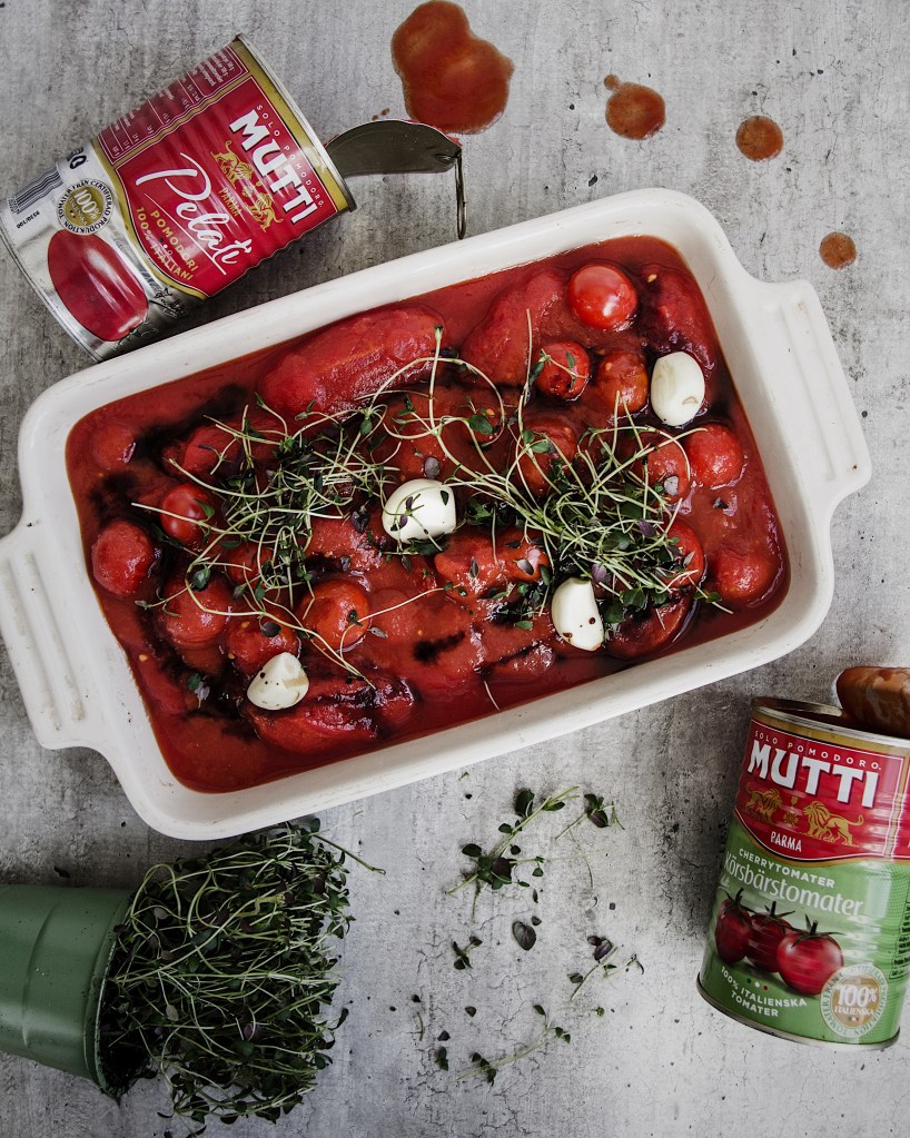 Värm ugnen till 200 g över och undervärme. Häll alla konserverade tomater i en ugnsform. Skala och lägg ner vitlöksklyftorna innan du toppar med balsamvinäger och ett par nypor timjanskvistar. Baka i ugnen i ca 1 h.