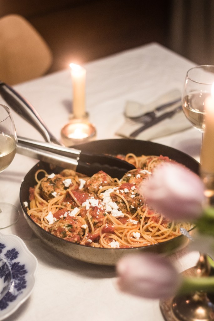 - Häll såsen över färsbollarna i stekpannan. Lägg gärna på ett lock och låt dem gå minst 5 minuter eller tills genomlagade.