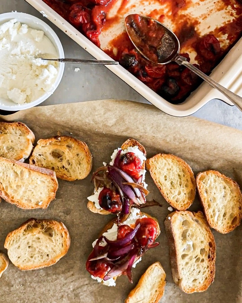- Servera tomaterna när de svalnat något på brödet med ricotta i botten och den karamelliserade rödlöken på toppen.