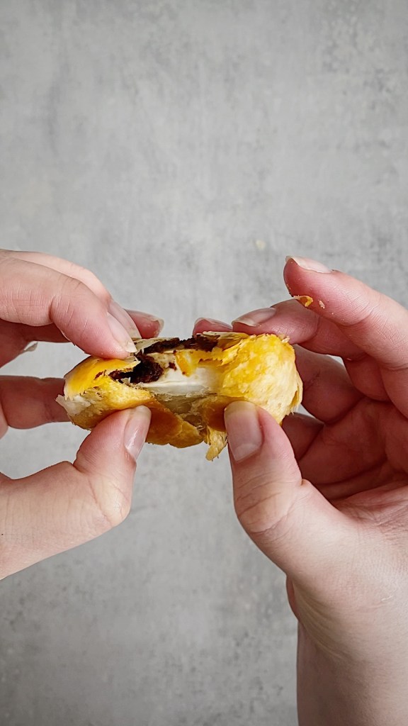 - Lägg en klick tomatcréme, ca 0,5 msk, på varje bit. Lägg på en bit av chèvren på tomatcremen och vik in kanterna på bullen. (se film här!)