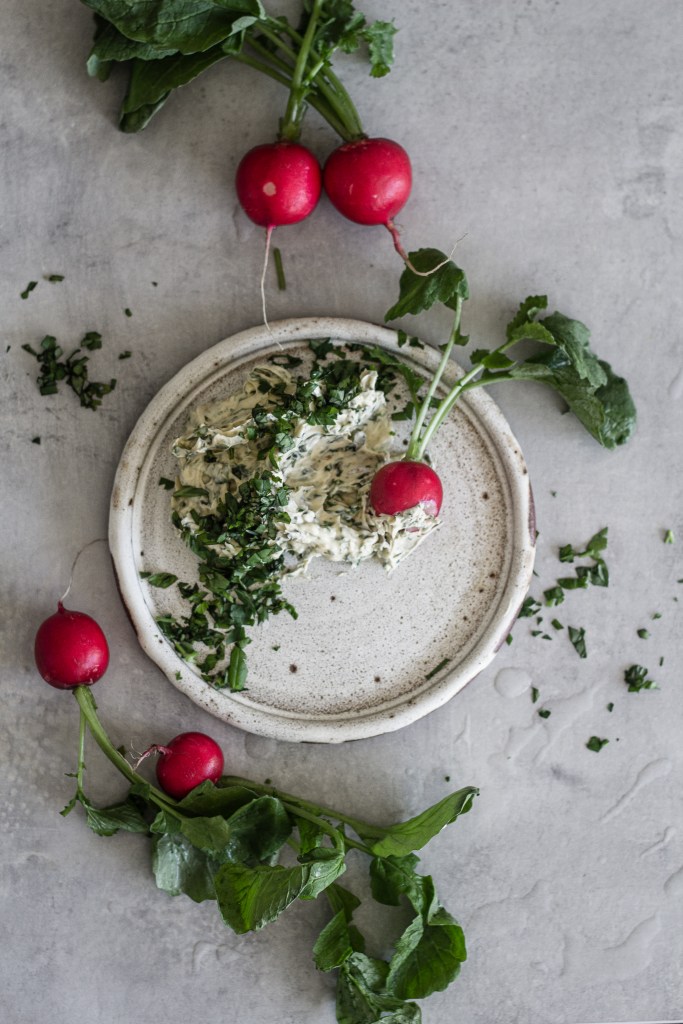 - Ta fram det kylda brynta smöret och en elvisp eller mixerstav. Vispa smöret fluffigt innan du vispar ner örterna.