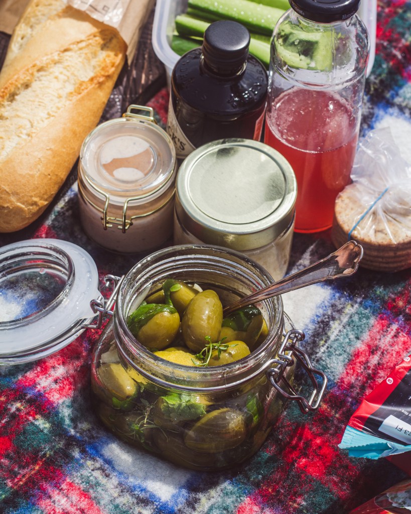 - Häll upp olivoljan i en burk. Tillsätt vitlök och citronskal innan du river ner de färska örterna. Addera oliverna i burken och rör om ordentligt.