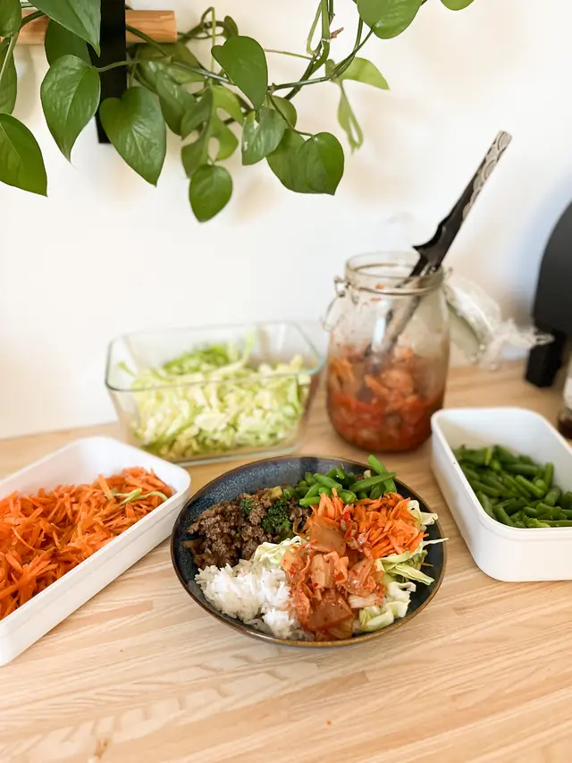 - Servera med ris och grönsaker, jag föredrar vitkål, morot och gröna bönor!