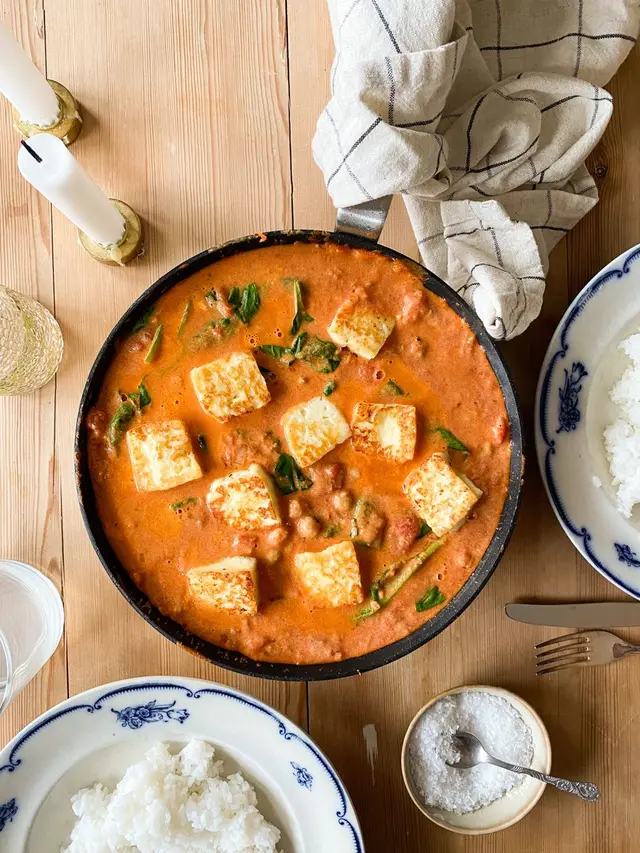 - I samma panna fräser du lök, vitlök, ingefära, garam masala, kikärtor och tomatpuré i ett par minuter.
