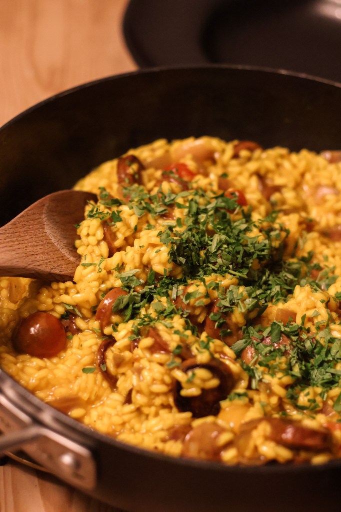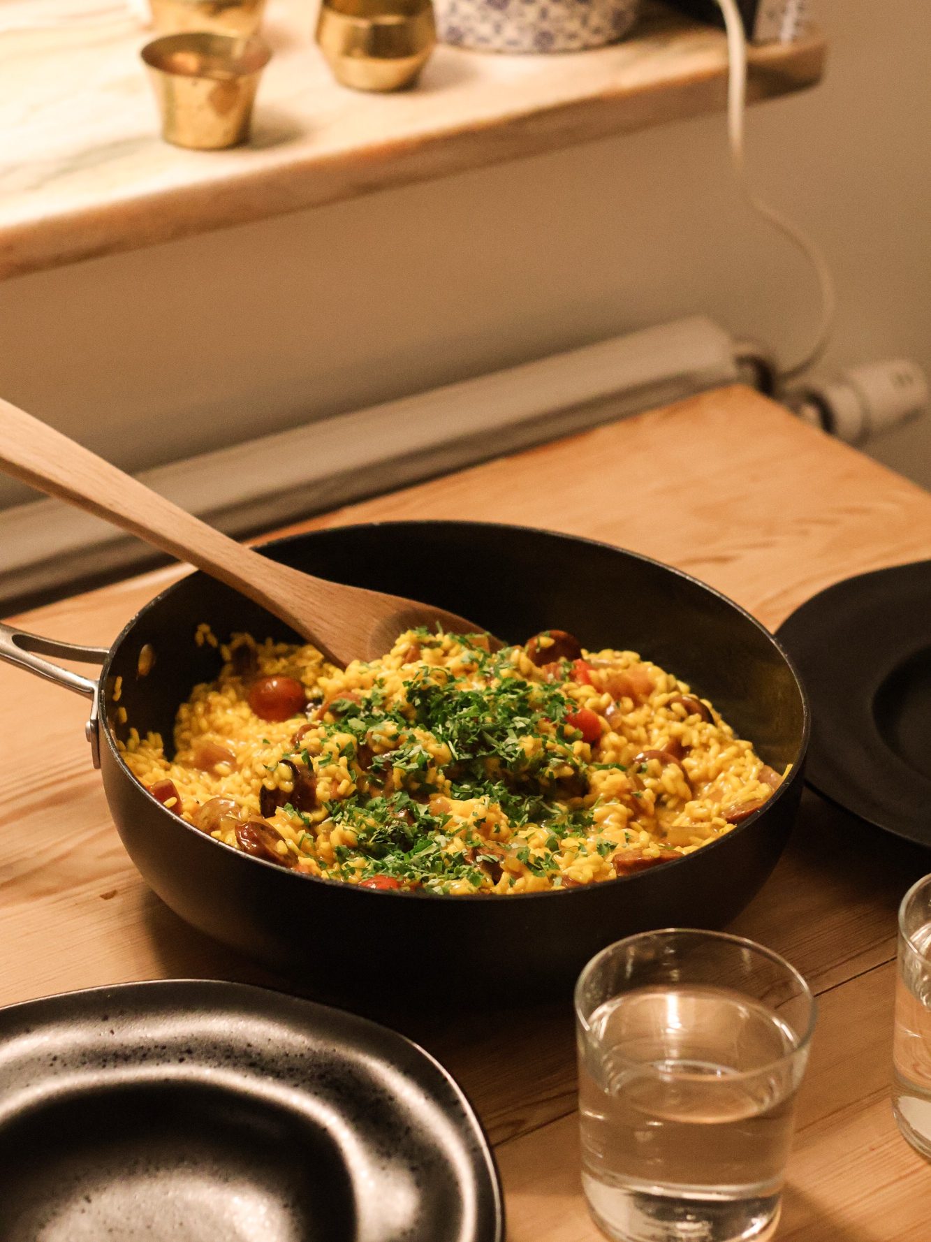 - Fräs lök och vitlök i fettet från korven. När löken börjar bli glansig och mjuk tillsätter du riset och fräser ett par minuter till. Tillsätt sedan saffranet, rör om ordentligt och fräs någon minut till.