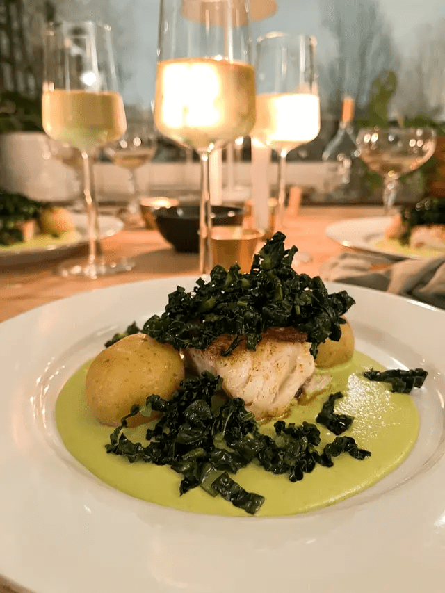 - Servera torsken på en spegel av creme ninon såsen. Placera ut potatisen så att det det aptitligt ut och toppa med svartkålen.
