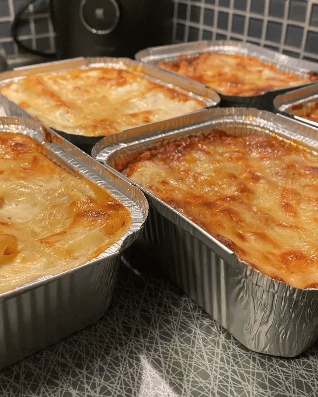 - I portionsformar varvar du köttfärsås, kesoröran och halverade lasagneplattor (så de får plats i formen) toppa med riven ost.