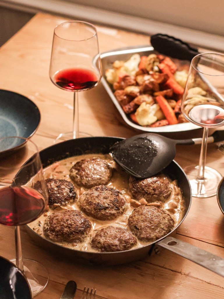 Ett riktigt smarrigt recept, biffarna blir fluffiga och smakrika och den krämiga såsen är ljuvlig att doppa rotfrukterna i. Prata igenom alla viktiga samtalsämnen innan ni börjar äta – det blir svårt att prata när man skyfflar maten in i munnen.