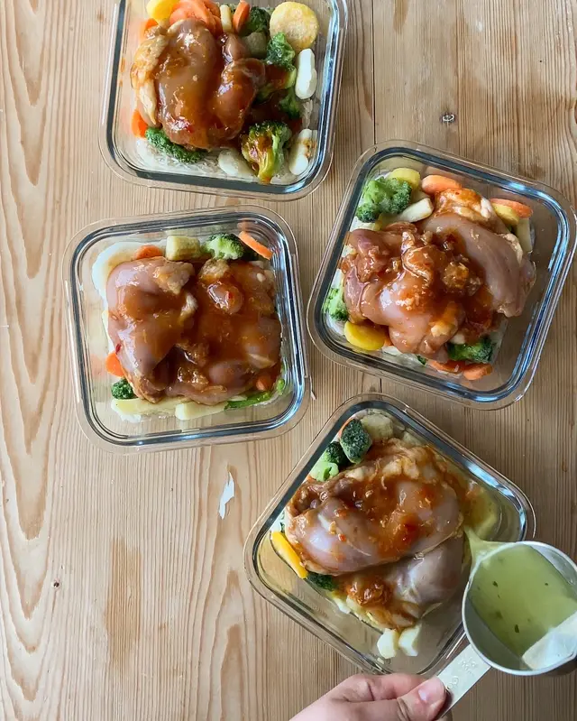 - Tillsätt 0,75 dl kycklingbuljong i varje matlåda tillsammans med 2 kycklinglårfiléer.
