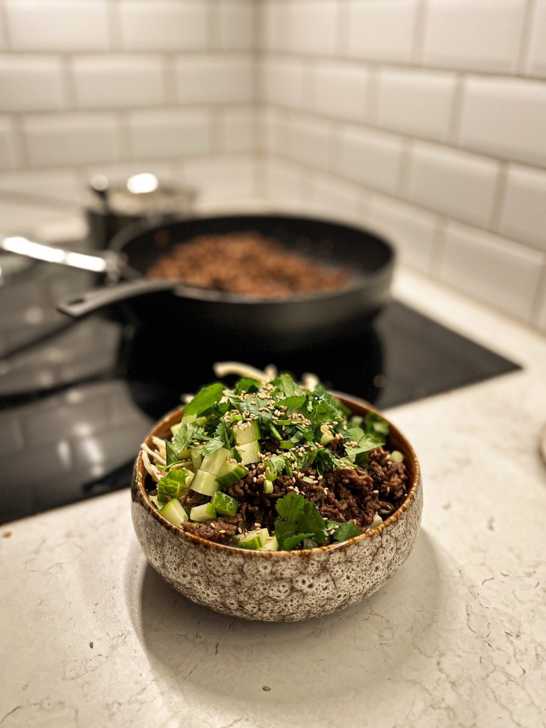 - Servera i en skål: grunda med ris, toppa med färs, vitkålssallad och grönsaker. På slutet har du på koriander och sesamfrön.