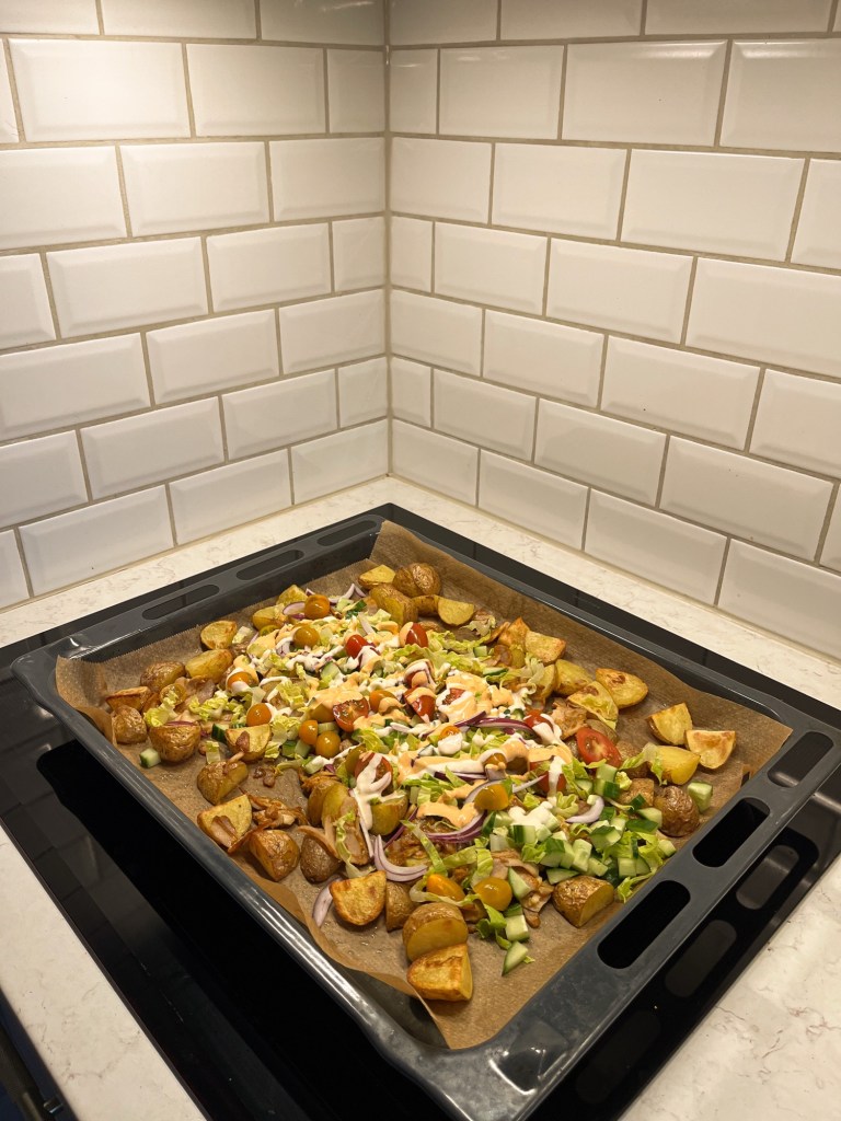 Ett busenkelt sätt att göra en lite färschare kebabtallrik som går att variera i oändlighet. Om du vill kan du bygga kebabtallriken direkt på tallriken istället för i plåten. Då förflyttar du bara innehållet från plåten till tallriken innan steg 7.