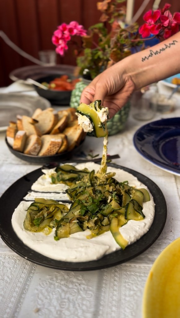 - Bre fetaostkrämen över ett fat, toppa med den svalnade marinerade zucchinin och eventuellt lite extra färska örter.