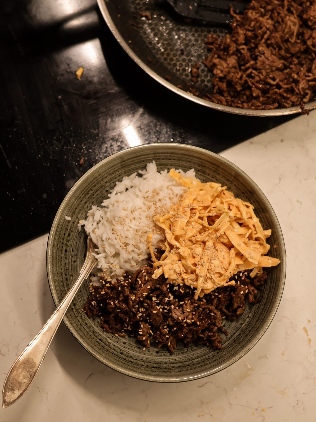 En otroligt snabblagad och enkel middag. Det som tog längst tid för mig var att koka riset till. Gochujang coleslaw kan du göra i förväg om du vill att det ska gå ännu snabbare men den tar ca 5 minuter att veva ihop så det tror jag inte behövs.