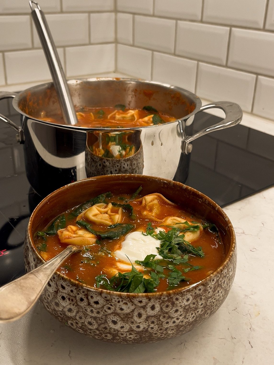 Den här middagen var färdig på förmodligen under 15 minuter, soppan går snabbt att koka upp och väljer du en färsk tortellini så kokar den klart på nolltid – perfekt när man bara vill ha middag nyss!